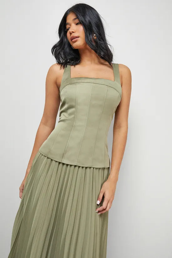 Satin Fitted Bodice Chiffon Pleated Skirt Midi Dress